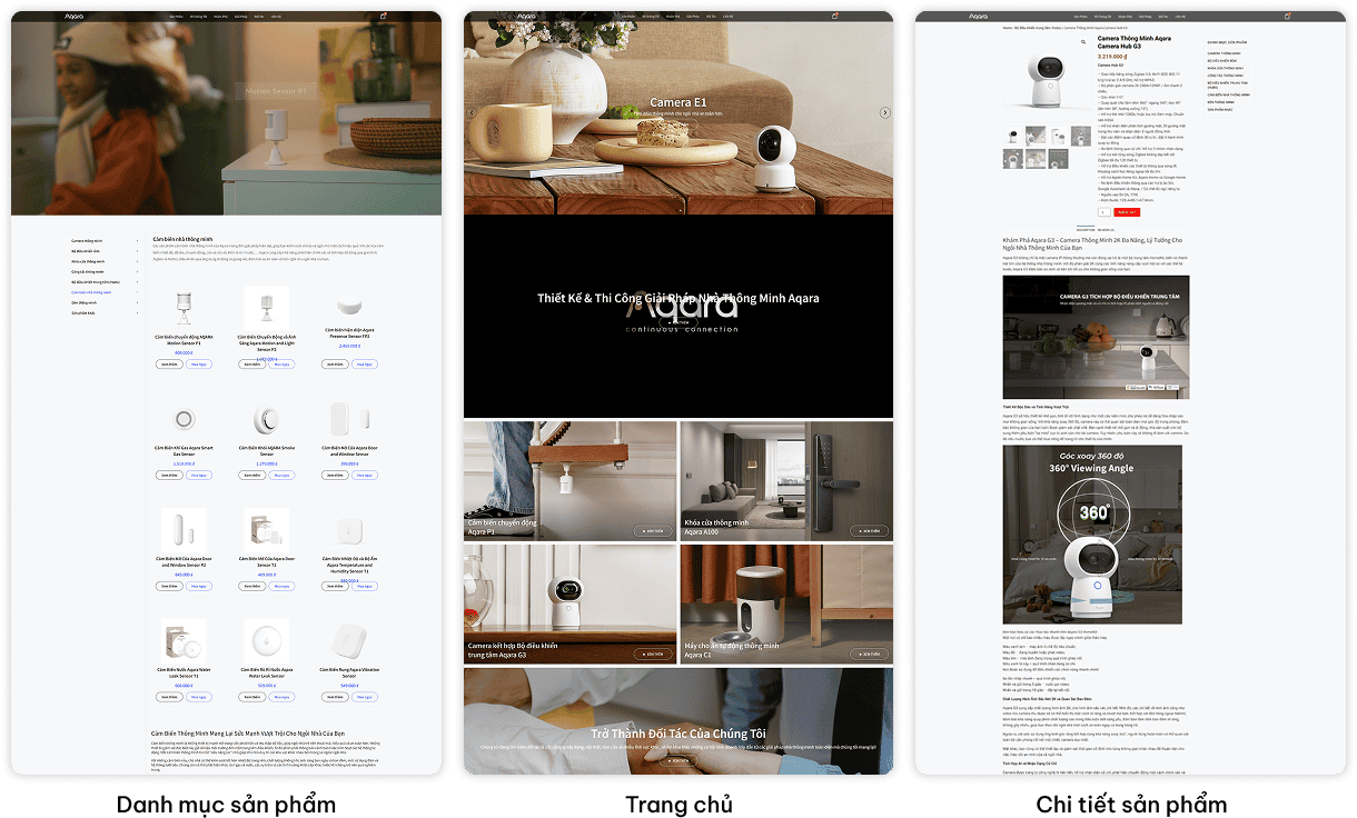 Website Aqara được phát triển nhằm mang đến trải nghiệm dễ dàng và chuyên nghiệp cho khách hàng, từ việc tìm hiểu sản phẩm, so sánh tính năng, đến đặt mua thiết bị hoặc tham khảo các giải pháp smart home trọn gói. Giao diện được thiết kế tinh gọn, trực quan và tối ưu chuẩn SEO, cho phép người dùng nhanh chóng tiếp cận thông tin chỉ trong vài thao tác.