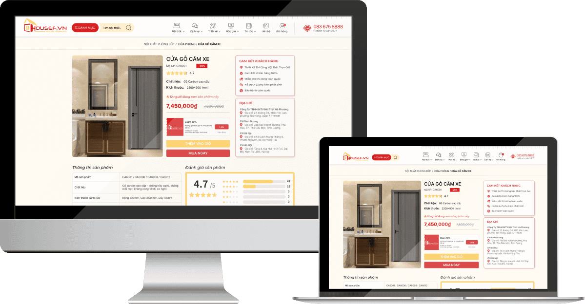 Ngoài ra, các tiện ích như đánh giá sao, thông tin cam kết chất lượng, địa chỉ showroom, cùng các nút “Thêm vào giỏ” và “Mua ngay” được bố trí hợp lý. Điều này không chỉ nâng cao trải nghiệm mua sắm trực tuyến mà còn thúc đẩy quyết định mua hàng nhanh chóng, hiệu quả.